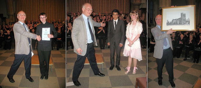 John Rutter, CBE presents the competion winner, Tom Bridges, (his work: Qui Autem Sperant) and runners up Sarah Mees (her work Always Race Ahead) and Murray Ashdown (his work: Citius, Altius, Fortius) at Eltham Choral Society's concert, Saturday, 30th June 2012. John is presented with a lithograph of Westminster Abbey by local artist George Fanshawe as a token of ECS' appreciation.