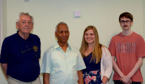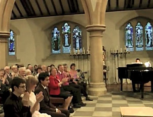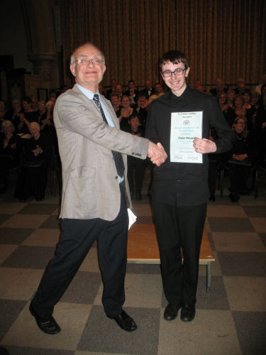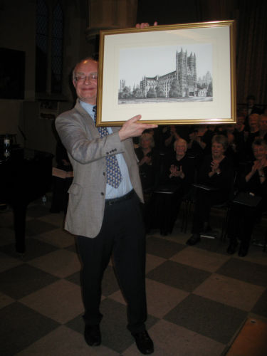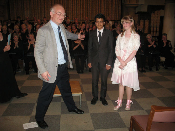 John Rutter, CBE presents the competion winner, Tom Bridges, (his work: Qui Autem Sperant) and runners up Sarah Mees (her work Always Race Ahead) and Murray Ashdown (his work: Citius, Altius, Fortius) at Eltham Choral Society's concert, Saturday, 30th June 2012. John is presented with a lithograph of Westminster Abbey by local artist George Fanshawe as a token of ECS' appreciation.